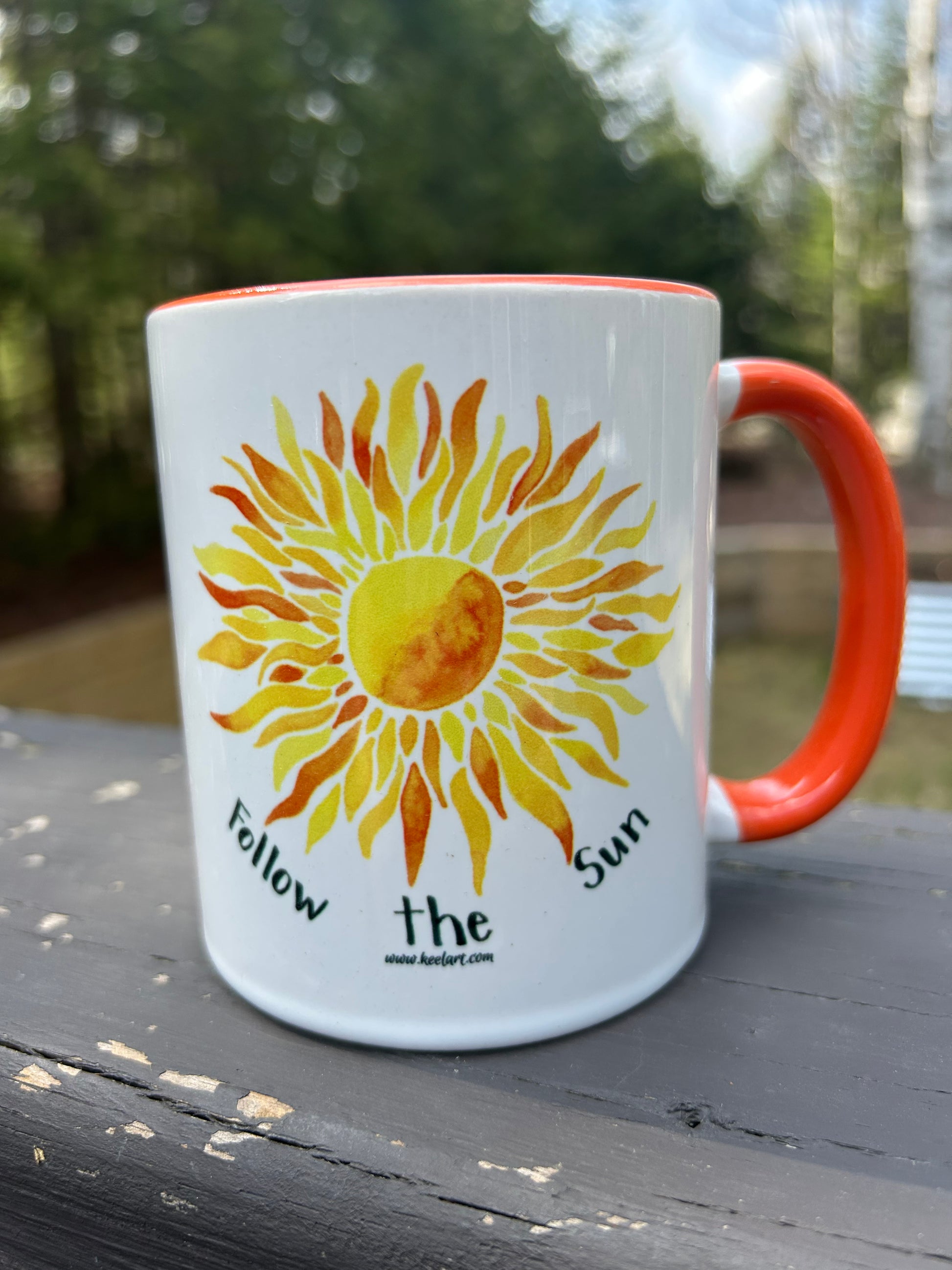 This mug features the same watercolor sun and words "Follow the Sun" on both sides with an orange handle and interior.